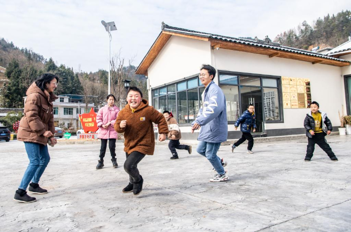1月24日(ri),在重慶市巫山縣騾坪鎮路口(kou)村數字(zi)農家書屋外,“臨時家長”和孩子們(men)一起玩游戲。