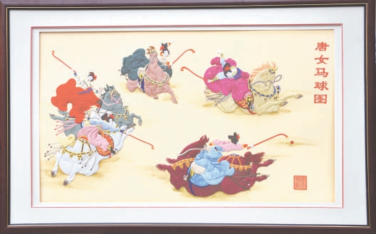 北京補(bu)繡代表作(zuo)《唐女馬球圖》,色(se)彩(cai)明艷(yan),動感十足。