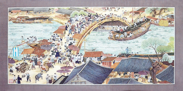 《清(qing)明(ming)上(shang)河圖》大量采用硬撥、浮 雕 撥、剪(jian)貼(tie)、柳繡(xiu)、抽絲、繪(hui)畫、打籽繡(xiu)、編(bian)織等工藝(yi)。