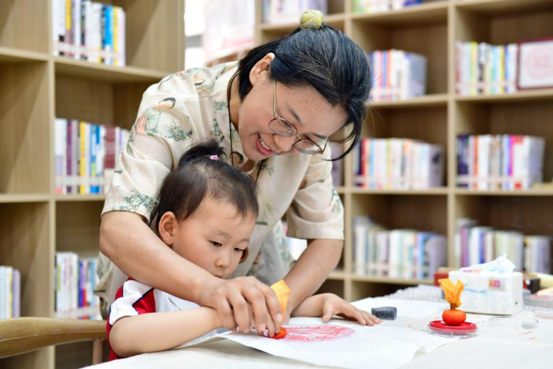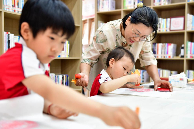 5月23日,在日照市東港區(qu)城市書房石臼所館,志(zhi)愿者在教孩(hai)子拓印。