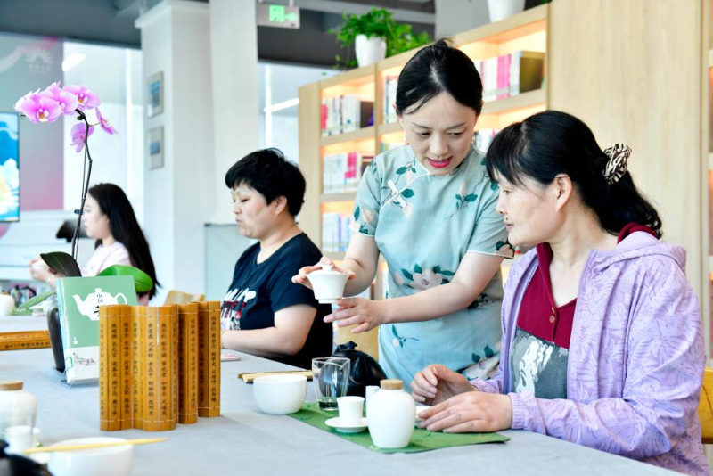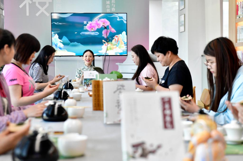 5月(yue)23日(ri),市民在日(ri)照市東(dong)港(gang)區城市書(shu)房櫻花園館學習茶藝。