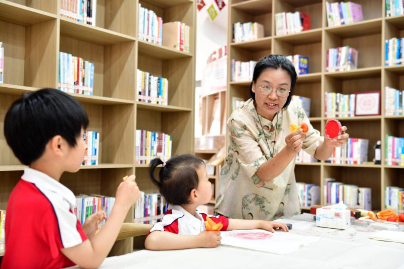 5月23日,在日照市東(dong)港區(qu)城市書房石臼所(suo)館,志愿者(zhe)在教孩子拓印。