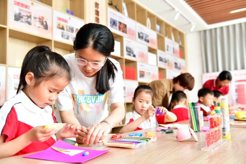 5月23日,在(zai)日照(zhao)市(shi)東港區城市(shi)書房石臼(jiu)所館,志愿(yuan)者在(zai)教孩子制作黏(nian)土畫。