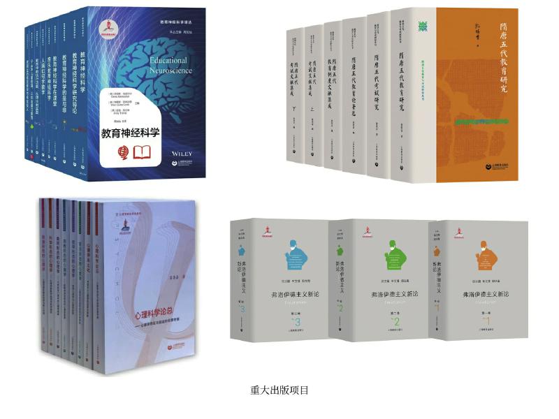 上教(jiao)(jiao)(jiao)社(she)密(mi)切(qie)關(guan)注新時代教(jiao)(jiao)(jiao)育(yu)(yu)(yu)(yu)(yu)(yu)(yu)(yu)發展的(de)(de)(de)重(zhong)大(da)(da)理(li)論(lun)(lun)問(wen)題與(yu)現實問(wen)題,響應國(guo)(guo)(guo)家(jia)(jia)教(jiao)(jiao)(jiao)育(yu)(yu)(yu)(yu)(yu)(yu)(yu)(yu)發展戰略需求,精心(xin)布局學(xue)(xue)(xue)術(shu)專業出(chu)(chu)(chu)版(ban)(ban)“大(da)(da)項目”,連續入(ru)選國(guo)(guo)(guo)家(jia)(jia)重(zhong)點出(chu)(chu)(chu)版(ban)(ban)物(wu)出(chu)(chu)(chu)版(ban)(ban)規劃(hua)、2013—2025年(nian)國(guo)(guo)(guo)家(jia)(jia)辭書編(bian)(bian)纂出(chu)(chu)(chu)版(ban)(ban)規劃(hua),獲國(guo)(guo)(guo)家(jia)(jia)出(chu)(chu)(chu)版(ban)(ban)基金資助。這其中(zhong)(zhong)(zhong)(zhong)(zhong)除(chu)前文中(zhong)(zhong)(zhong)(zhong)(zhong)的(de)(de)(de)大(da)(da)型專科(ke)(ke)工具書,還(huan)包括一系列教(jiao)(jiao)(jiao)育(yu)(yu)(yu)(yu)(yu)(yu)(yu)(yu)與(yu)心(xin)理(li)學(xue)(xue)(xue)原(yuan)創研(yan)(yan)究(jiu)(jiu)和(he)(he)(he)前沿研(yan)(yan)究(jiu)(jiu)成果(guo):由中(zhong)(zhong)(zhong)(zhong)(zhong)國(guo)(guo)(guo)教(jiao)(jiao)(jiao)育(yu)(yu)(yu)(yu)(yu)(yu)(yu)(yu)史(shi)學(xue)(xue)(xue)者(zhe)(zhe)孫培青編(bian)(bian)著的(de)(de)(de)“隋唐五代教(jiao)(jiao)(jiao)育(yu)(yu)(yu)(yu)(yu)(yu)(yu)(yu)與(yu)考(kao)試研(yan)(yan)究(jiu)(jiu)叢(cong)書”,構(gou)建(jian)了反映隋唐五代教(jiao)(jiao)(jiao)育(yu)(yu)(yu)(yu)(yu)(yu)(yu)(yu)與(yu)考(kao)試全貌(mao)的(de)(de)(de)教(jiao)(jiao)(jiao)育(yu)(yu)(yu)(yu)(yu)(yu)(yu)(yu)理(li)論(lun)(lun)體系和(he)(he)(he)文獻(xian)資料體系,是中(zhong)(zhong)(zhong)(zhong)(zhong)國(guo)(guo)(guo)教(jiao)(jiao)(jiao)育(yu)(yu)(yu)(yu)(yu)(yu)(yu)(yu)史(shi)學(xue)(xue)(xue)科(ke)(ke)建(jian)設(she)的(de)(de)(de)一項學(xue)(xue)(xue)術(shu)文化積(ji)累工程(cheng)(cheng);《中(zhong)(zhong)(zhong)(zhong)(zhong)國(guo)(guo)(guo)課(ke)程(cheng)(cheng)史(shi)》以現代課(ke)程(cheng)(cheng)理(li)論(lun)(lun)為分析框架,以歷(li)史(shi)線索展現中(zhong)(zhong)(zhong)(zhong)(zhong)國(guo)(guo)(guo)學(xue)(xue)(xue)校課(ke)程(cheng)(cheng)的(de)(de)(de)新陳代謝;“教(jiao)(jiao)(jiao)育(yu)(yu)(yu)(yu)(yu)(yu)(yu)(yu)神(shen)經(jing)(jing)科(ke)(ke)學(xue)(xue)(xue)譯叢(cong)”(9冊(ce))是我國(guo)(guo)(guo)首(shou)個聚焦教(jiao)(jiao)(jiao)育(yu)(yu)(yu)(yu)(yu)(yu)(yu)(yu)神(shen)經(jing)(jing)科(ke)(ke)學(xue)(xue)(xue)這一國(guo)(guo)(guo)際(ji)教(jiao)(jiao)(jiao)育(yu)(yu)(yu)(yu)(yu)(yu)(yu)(yu)研(yan)(yan)究(jiu)(jiu)前沿領域的(de)(de)(de)學(xue)(xue)(xue)術(shu)譯介系列;《中(zhong)(zhong)(zhong)(zhong)(zhong)國(guo)(guo)(guo)傳(chuan)統德(de)育(yu)(yu)(yu)(yu)(yu)(yu)(yu)(yu)心(xin)理(li)學(xue)(xue)(xue)思想(xiang)新論(lun)(lun)》系統挖掘整理(li)中(zhong)(zhong)(zhong)(zhong)(zhong)華優秀傳(chuan)統文化中(zhong)(zhong)(zhong)(zhong)(zhong)蘊含(han)的(de)(de)(de)德(de)育(yu)(yu)(yu)(yu)(yu)(yu)(yu)(yu)心(xin)理(li)學(xue)(xue)(xue)思想(xiang),構(gou)建(jian)中(zhong)(zhong)(zhong)(zhong)(zhong)國(guo)(guo)(guo)特(te)(te)色(se)心(xin)理(li)學(xue)(xue)(xue)話語(yu)體系;我國(guo)(guo)(guo)第一套以大(da)(da)心(xin)理(li)學(xue)(xue)(xue)觀,從本(ben)土(tu)心(xin)理(li)學(xue)(xue)(xue)視(shi)角系統探索和(he)(he)(he)解讀不同形態(tai)心(xin)理(li)學(xue)(xue)(xue)的(de)(de)(de)學(xue)(xue)(xue)術(shu)系列“心(xin)理(li)學(xue)(xue)(xue)形態(tai)研(yan)(yan)究(jiu)(jiu)系列”(6冊(ce)),全景(jing)(jing)考(kao)察心(xin)理(li)學(xue)(xue)(xue)的(de)(de)(de)命運與(yu)前途,深入(ru)探索中(zhong)(zhong)(zhong)(zhong)(zhong)國(guo)(guo)(guo)本(ben)土(tu)心(xin)理(li)學(xue)(xue)(xue)的(de)(de)(de)選擇與(yu)突破;《弗(fu)洛伊(yi)德(de)主(zhu)(zhu)(zhu)義新論(lun)(lun)》(三卷)匯聚國(guo)(guo)(guo)內弗(fu)洛伊(yi)德(de)主(zhu)(zhu)(zhu)義研(yan)(yan)究(jiu)(jiu)領域的(de)(de)(de)權(quan)威(wei)學(xue)(xue)(xue)者(zhe)(zhe),歷(li)史(shi)展現弗(fu)洛伊(yi)德(de)理(li)論(lun)(lun)的(de)(de)(de)百年(nian)發展歷(li)程(cheng)(cheng),提供弗(fu)洛伊(yi)德(de)主(zhu)(zhu)(zhu)義研(yan)(yan)究(jiu)(jiu)的(de)(de)(de)“全景(jing)(jing)圖”。這些重(zhong)大(da)(da)出(chu)(chu)(chu)版(ban)(ban)項目為構(gou)建(jian)中(zhong)(zhong)(zhong)(zhong)(zhong)國(guo)(guo)(guo)特(te)(te)色(se)自(zi)主(zhu)(zhu)(zhu)知識(shi)體系,建(jian)設(she)中(zhong)(zhong)(zhong)(zhong)(zhong)國(guo)(guo)(guo)教(jiao)(jiao)(jiao)育(yu)(yu)(yu)(yu)(yu)(yu)(yu)(yu)學(xue)(xue)(xue)和(he)(he)(he)心(xin)理(li)學(xue)(xue)(xue)學(xue)(xue)(xue)科(ke)(ke)體系、學(xue)(xue)(xue)術(shu)體系、話語(yu)體系發揮了重(zhong)要作(zuo)用。
