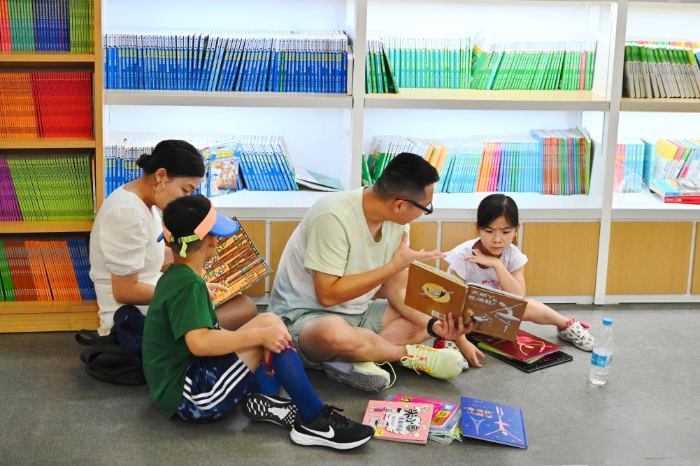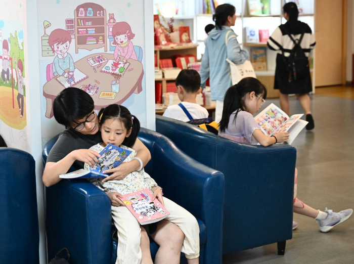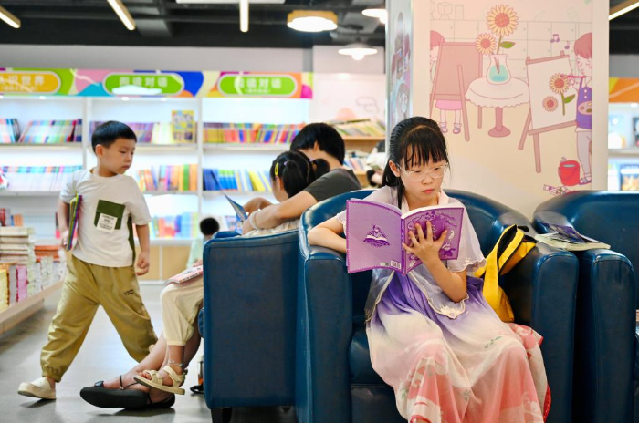 7月(yue)6日,福州新華書(shu)店鰲峰坊書(shu)城內家長陪(pei)伴孩子讀書(shu)納(na)涼。