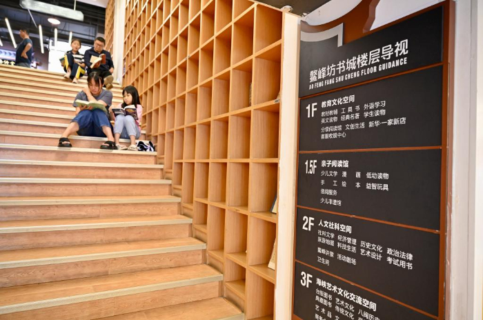 7月6日,福州(zhou)新華書(shu)(shu)店鰲(ao)峰坊書(shu)(shu)城(cheng)內(nei)家(jia)長陪伴孩子讀書(shu)(shu)納涼。