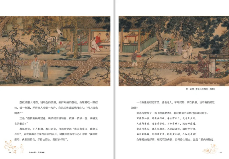 值得一提的(de)(de)事,這本書有(you)很(hen)多(duo)稀見的(de)(de)插圖(tu)。比(bi)如讀到司(si)馬相如的(de)(de)時候,配有(you)明代(dai)仇英的(de)(de)《上(shang)林圖(tu)》;比(bi)如說曹植,所(suo)用的(de)(de)顧愷之《洛(luo)神賦(fu)(fu)圖(tu)》也是根據曹植傳(chuan)世(shi)名篇《洛(luo)神賦(fu)(fu)》而來;寫白居易則是用謝環的(de)(de)《香山九長老圖(tu)》。