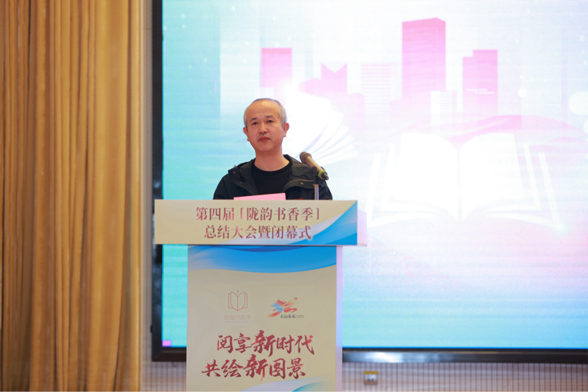 肖學智館長回顧并總結(jie)了第(di)四屆“隴韻書(shu)(shu)香季”舉辦的概況和(he)取得(de)的成效。他表示,“今(jin)年(nian)‘隴韻書(shu)(shu)香季’期間,我(wo)們(men)(men)(men)聯(lian)動(dong)全省多(duo)家(jia)(jia)圖(tu)書(shu)(shu)館,開展了30大(da)(da)項共(gong)百(bai)余場閱(yue)讀推廣活動(dong),并將部分重點活動(dong)帶向基層(ceng)圖(tu)書(shu)(shu)館,擴大(da)(da)書(shu)(shu)香季‘朋(peng)友圈’,共(gong)謀‘大(da)(da)家(jia)(jia)’發(fa)展;今(jin)年(nian),我(wo)們(men)(men)(men)更加重視品牌宣傳,借(jie)助社會(hui)名家(jia)(jia)、網絡達(da)人的力量,喜提多(duo)個‘熱點’和(he)‘熱搜’;今(jin)年(nian),隴韻書(shu)(shu)香季系(xi)列活動(dong)榮獲多(duo)個獎項,讓我(wo)們(men)(men)(men)在(zai)鼓勵與(yu)(yu)肯定(ding)中堅定(ding)信心。未來我(wo)們(men)(men)(men)將繼續與(yu)(yu)各(ge)兄弟單位、媒體(ti)、全省讀者(zhe)朋(peng)友們(men)(men)(men)攜手前行(xing),用高質量的閱(yue)讀推廣發(fa)展成果助力“書(shu)(shu)香隴原”建設。”