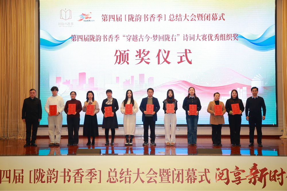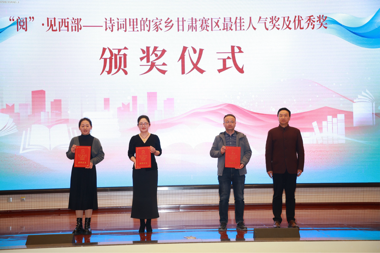 閉幕式上公布(bu)并表彰(zhang)了“優(you)秀(xiu)閱(yue)讀推廣活動案例獎(jiang)”獲獎(jiang)人(ren)(ren)員、“‘穿越古(gu)今(jin)·夢回隴右’詩詞(ci)大賽(sai)優(you)秀(xiu)組(zu)織獎(jiang)”獲獎(jiang)人(ren)(ren)員、“‘閱(yue)·見西部’第一季——‘詩歌(ge)里的(de)家(jia)鄉’(甘肅賽(sai)區)最佳人(ren)(ren)氣獎(jiang)和優(you)秀(xiu)獎(jiang)”獲獎(jiang)人(ren)(ren)員。