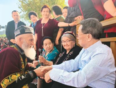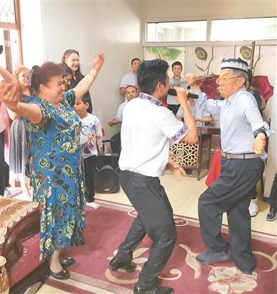 王蒙(右一(yi))與新疆少數民族群(qun)眾一(yi)起跳(tiao)舞。