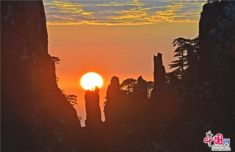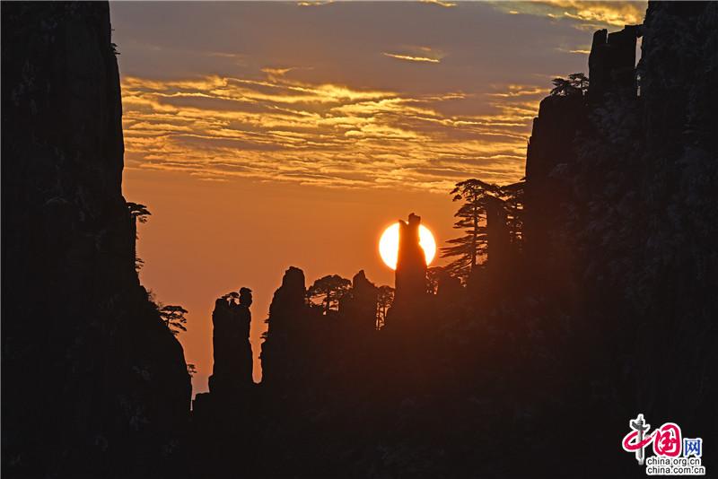 【點睛】新年伊始,黃山風景區迎接今年的第一縷陽光,在一片歡呼聲中太陽跳出了地平線來到了黃山之巔。