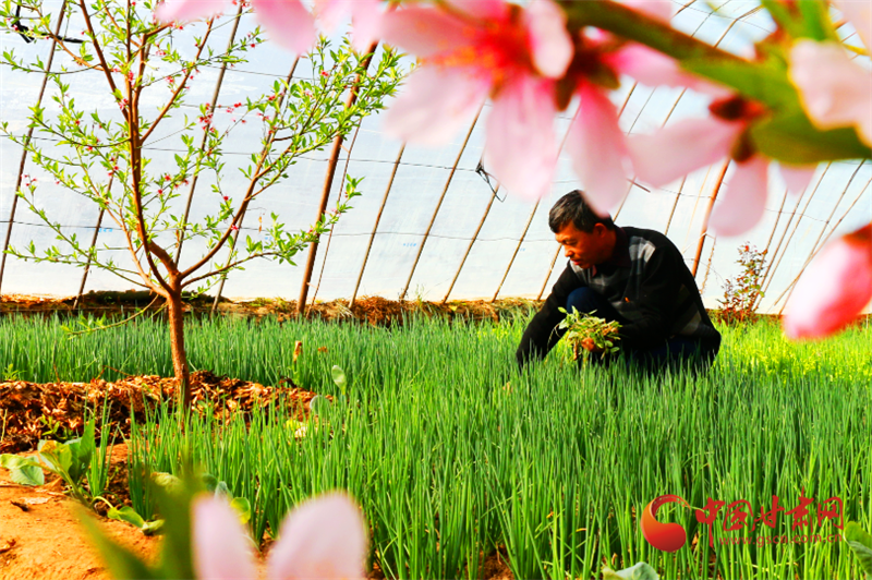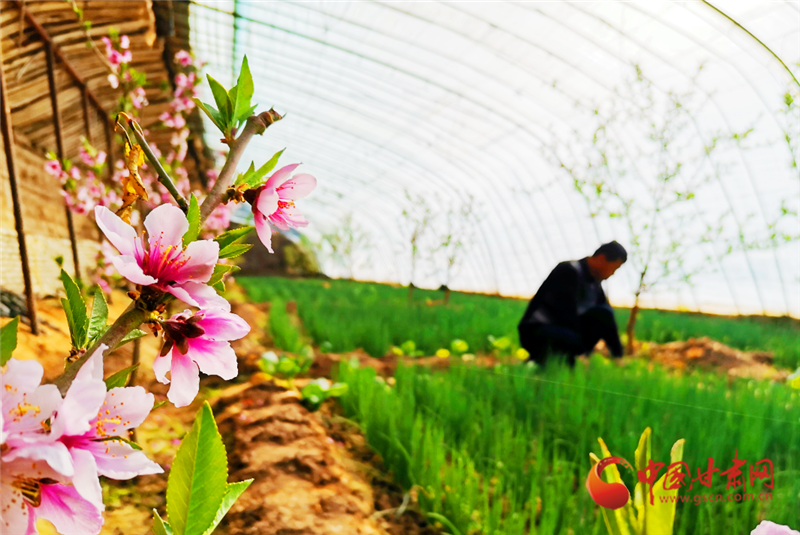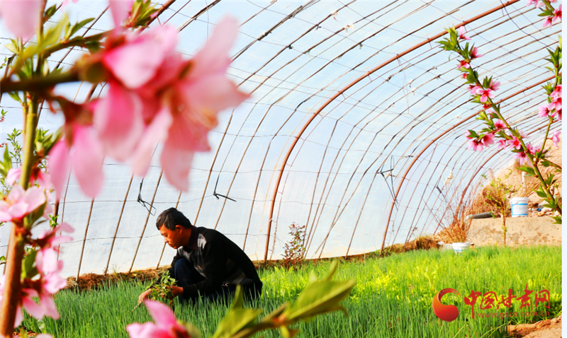走進敦煌市月牙泉鎮現代采摘園區農民陶寶憲的溫室大棚,粉紅的桃花開得正艷,濃濃春意撲面而來,在花香的陪伴下,陶寶憲在大棚中辛勤勞作。
