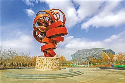 公園里《中華第一爆》的主碑,由雕塑家何鄂創作,它顏色呈鐵銹紅,金屬構件回環纏繞,形象地模擬了“蘑菇云”的形狀。