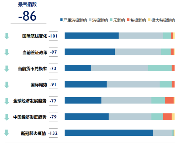 整體(ti)而言,從業(ye)者預期以上(shang)7項因(yin)素(su)均將對2020年上(shang)半年出(chu)境旅游(you)市場業(ye)績產(chan)生負面影響,導致整體(ti)景氣指數下(xia)降至(zhi)-86。其(qi)中,正于全球蔓延的(de)新冠疫(yi)情被(bei)認(ren)為(wei)是限制(zhi)出(chu)境旅游(you)市場發展(zhan)的(de)最(zui)主要因(yin)素(su)。
