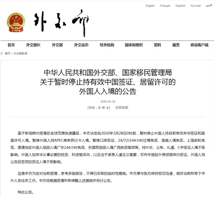 3月26日,中華人民共和國外交部、國家移民管理局發布《關于暫時停止持有效中國簽證、居留許可的外國人入境的公告》(以下簡稱《公告》),決定28日起,暫時(shi)停止外(wai)國人持(chi)目前有效來華簽證和居留(liu)許可入境(jing)。