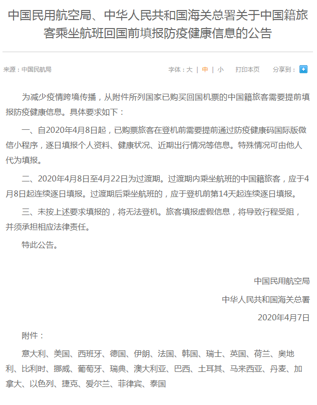 中國民用航空局、中華人民共和國海關總署4月7日聯合發布《關于中國籍旅客乘坐航班回國前填報防疫健康信息的公告》(以下簡稱《公告》)。《公告》指出,自4月8日起,從意大利、美國、西班牙等26個國家已購買回國機票的中國籍旅客需要在登機前提前填報防疫健康信息,包括逐日填報個人資料、健康狀況、近期出行情況等。旅客未按要求填報的,將無法登機;填報虛假信息,將導致行程受阻,并須承擔相應法律責任。