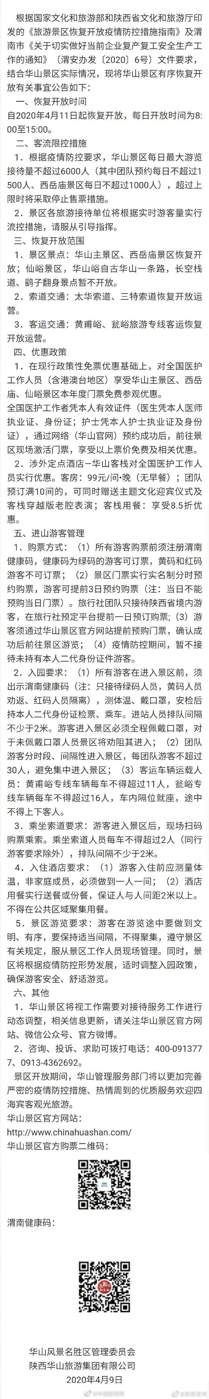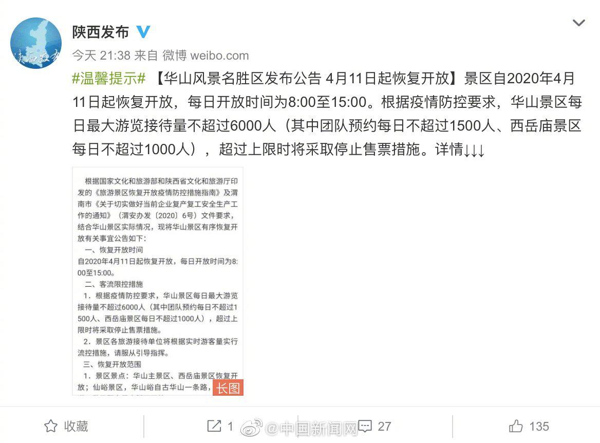 華山風景名勝區4月9日發布公告,宣布華山風景區4月11日起恢復開放。據@陜西發布 華山風景名勝區發布公告稱,自2020年4月11日起恢復開放,每日開放時間為8:00至15:00。