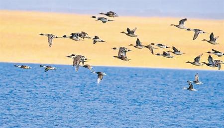 如今,在這道墨綠色的蘆葦梁上,在水位極度下降的大漠深處,保護區內仍有這樣的景致和創舉,實屬一個奇跡,一個故事。余秋雨先生曾在《沙不隱泉》一文中,慨嘆敦煌月牙泉的神奇與神韻。那么,天馬故鄉渥洼池,何嘗不是敦煌的又一個神奇與傳說?渥洼池周遭被茫茫大漠戈壁所圍困,大有狼吞虎咽之勢。但千百年來,漫天肆虐的黃沙不但沒有對它產生任何妨礙,反而讓這里成為敦煌有名的魚米之鄉。每到秋高氣爽,渥洼池畔水光瀲滟,碧波蕩漾,魚躍鴨游,黑鸛、白鷺、天鵝、大雁等珍貴水鳥優雅地涉于水邊,偶爾還有一群白鶴輕捷地掠過湖面,灑下一片蘇杭景致般的美麗。