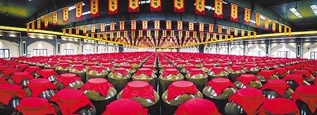 來到養酒館的三樓,這里儲存了大量的陶壇,它們整齊有序地擺放著,在陶壇上面懸掛著徽縣歷史上幾十家著名的老字號釀酒作坊的名號。“不要小看這些陶壇,它們里面可裝著金徽的‘寶貝’。”講解員說,這里面承裝著金徽的老酒,也是高端酒。每一壇都有標簽,注明了年份。