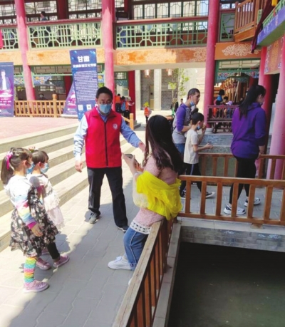 志愿者們不懼烈日,在古鎮開展文明勸導工作。當游客走累了,靠在欄桿處休息時,志愿者立即走過去耐心勸導游客,說明此處危險,并向游客指明休息場所;當有游客爬到景區禁止攀爬的設施上照相時,志愿者們耐心勸導,引導游客文明照相。在閑暇之余,志愿者還要在古鎮內撿煙頭、撿落地垃圾等。