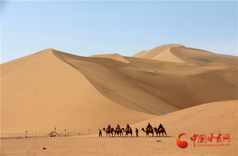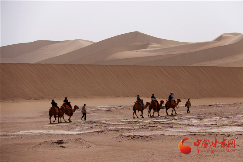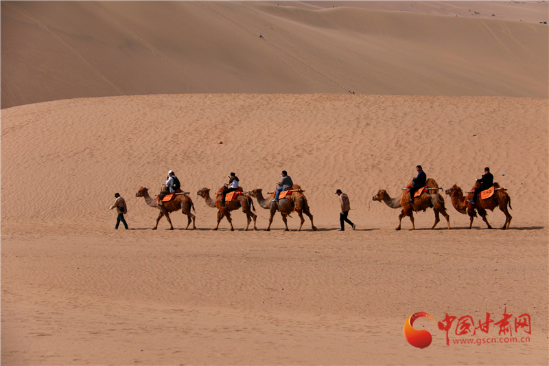 5月19日是中國旅游日,游客來到甘肅省敦煌市鳴沙山月牙泉景區,欣賞大漠壯美風光,體驗獨特絲路風情。