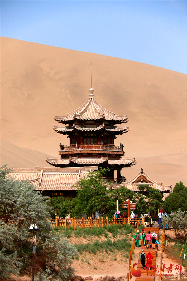 5月19日,游客在甘肅省敦煌市鳴沙山月牙泉景區游覽。