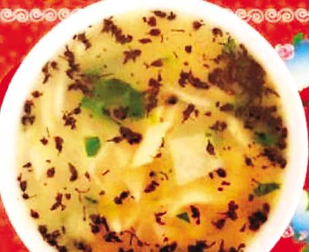 羊胡花熗面旗是將小麥面用淡鹽水和好,在鍋里注入水至沸騰放入好的蘿卜片,這時將和好的面在案板上用搟面杖搟成薄餅后切成菱形狀的小面片,然后把切好的面片下進鍋里,面煮熟后,將準備好的羊胡花熗油入鍋,“呲”一聲,一股清冽冽的香氣瞬時溢滿了整個屋子。此時香味撲鼻的羊胡花熗面旗就可出鍋食用了。那香氣,是初夏的陽光,有著暖人的喜氣。