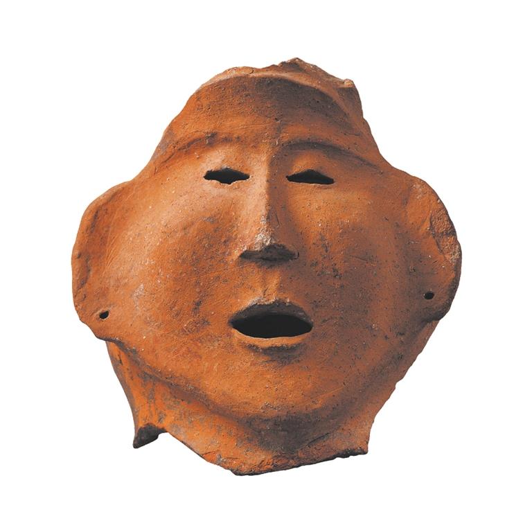 這只“紅陶人面”(距今約5200年)高顴闊面,眉骨微隆,表情呆萌憨厚。彩陶器皿不是碗缽,就是瓶盆,總之都是實用器皿,只不知這只彩陶人面是做什么用的?也許,是史前哪個小朋友模仿著身邊人的樣子摶著玩的。