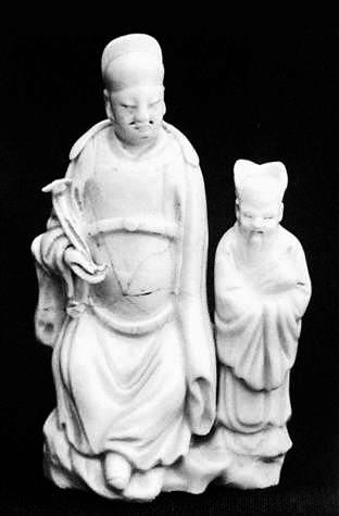 這件白瓷供養人像,為德化瓷人物像,釉面為純白色,色澤光潤明亮。整件雕塑由兩個人物構成,一大一小,一主一副。主像高13.7厘米,身穿典型的明代服飾,人物端坐在山石上,衣著瀟灑,神態自然從容,盡顯雍容華貴,而手執如意則似乎暗示著他內心的向往和追求。整個構圖自然放松,給人一種輕松的感覺。小人物則是長髯飄灑,笑容和藹可親,似乎帶著點職業習慣的微笑,雖然年紀比較大,但卻處于仆從的位置,手里還抱著一卷書。從一個側面烘托出了年輕主人的身份。