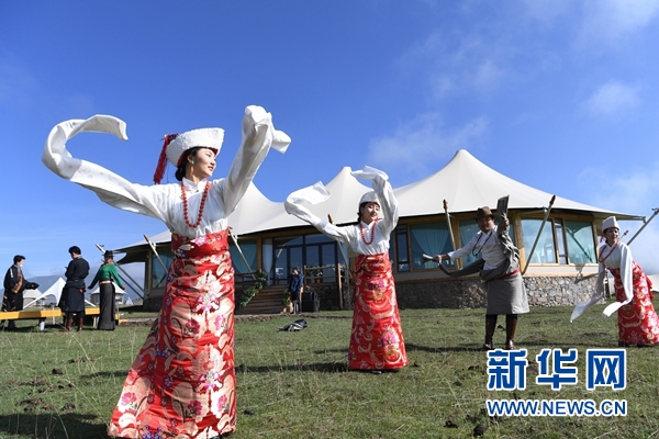 幾名藏族演員在甘南藏族自治州夏河縣阿木去乎鎮安果村阿米貢洪帳篷酒店的草原上表演舞蹈(5月25日攝)。新華社記者 陳斌 攝