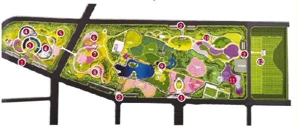 蘭州植物園二期規劃平面示意圖。 11 ①主入口 ②次入口 ③鏡湖云游 ④溫室植物園 ⑤藥用植物園 ⑥珍稀植物園 ⑦纖維植物園 ⑧兒童植物園 ⑨蘭州特色園 ⑩旱生植物園 彩葉植物園 生態培育 12