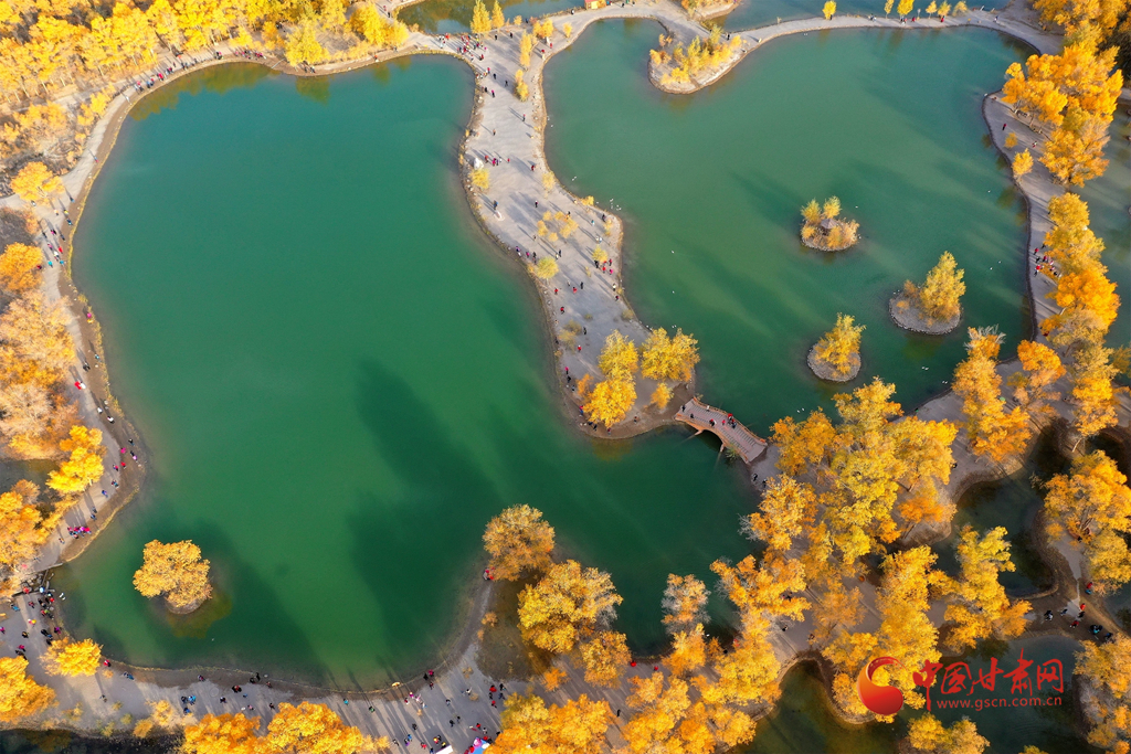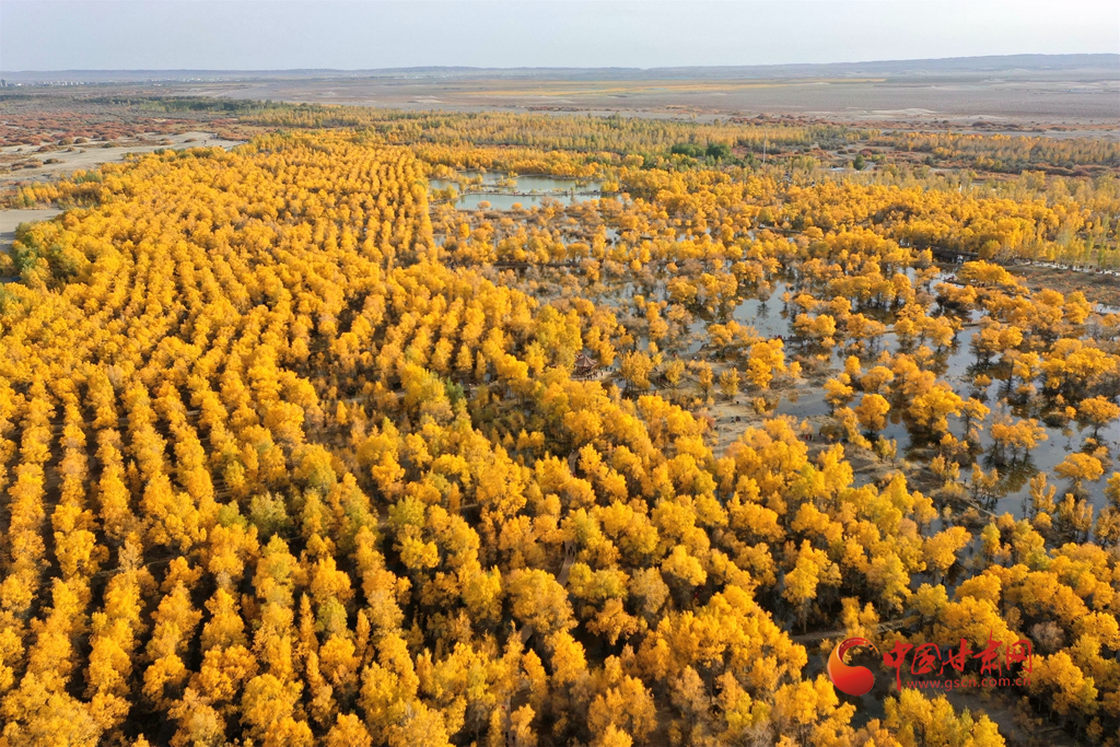 10月10日,在甘肅省酒泉市金塔沙漠胡楊林景區,胡楊林在陽光的照耀下金黃燦爛,與湖水相映,令人流連忘返。(無人機照片)