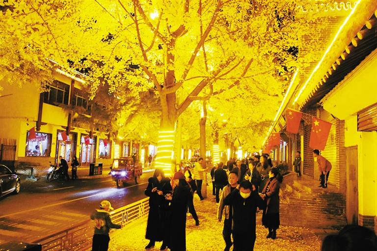 立冬前后,被稱為“黃金大道”的天水市青年南北路銀杏一條街,黃葉飛舞一地金黃,迎來一年中最佳觀賞期。 天水市秦州區青年南北路全長700余米,道路兩側種滿了銀杏樹。落葉季節,每到夜幕降臨后,銀杏樹上的LED金黃色燈帶亮燈后,整條街黃葉黃燈交相輝映,璀璨奪目,成了市民近日遛彎首選的“打卡”地。