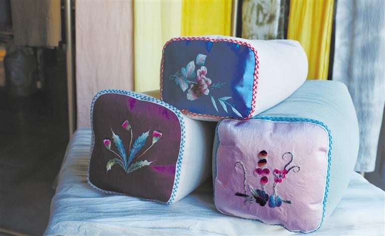 “農女手作”制作的非遺文創包括植物染絲巾、手工布包、刺繡小錢包、傳統頸椎保健枕、手工千層底老布鞋、手工刺繡壁掛、手工木梳、手工木飾品等。