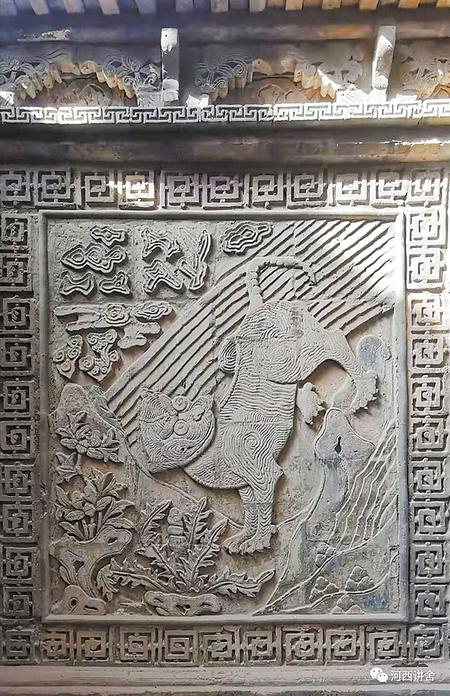 出了東別院,穿過正殿抱廈,在與之相對的西別院門口,門側墻面磚雕為:“福在眼前”,鐫刻著一只活潑可愛的小老虎,“虎”諧音“福”,也意右白虎。