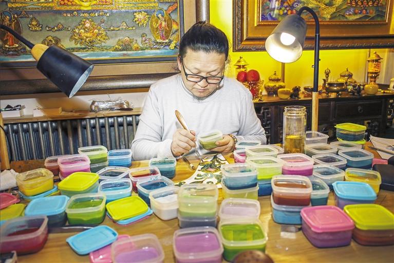 據李海明介紹,近年來,經常會受邀代表甘肅省文創去省外參展,而每次展出的琺瑯文創產品都會受到來自各地的年輕人的好評。“有時會把不同人創作的壁畫、唐卡等擺在一起展出,總有很多年輕人在我的作品前逗留良久,這說明他們對我的琺瑯釉色彩是非常認可的。”