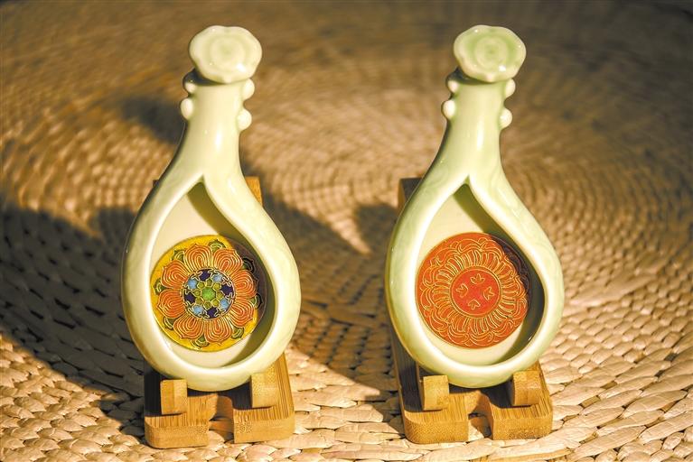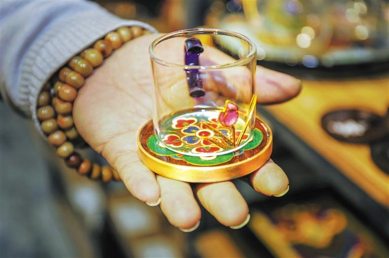 在李海明琺瑯藝術館,記者看到工藝師們正在專注地進行藝術創作。在展示架上,飛天琺瑯釉擺件、戲曲人物擺件、琺瑯墨匙、琺瑯茶墊等小文創作品令人目不暇接,就連手機殼、小鏡子這些小物件也因與琺瑯的融合變得新穎而獨特。