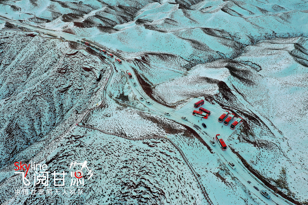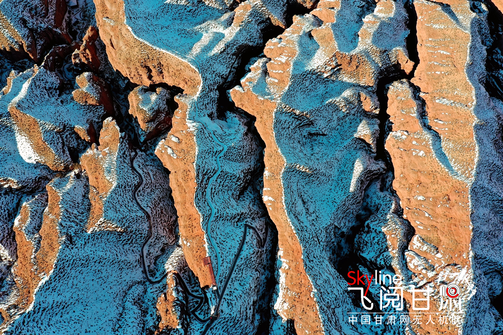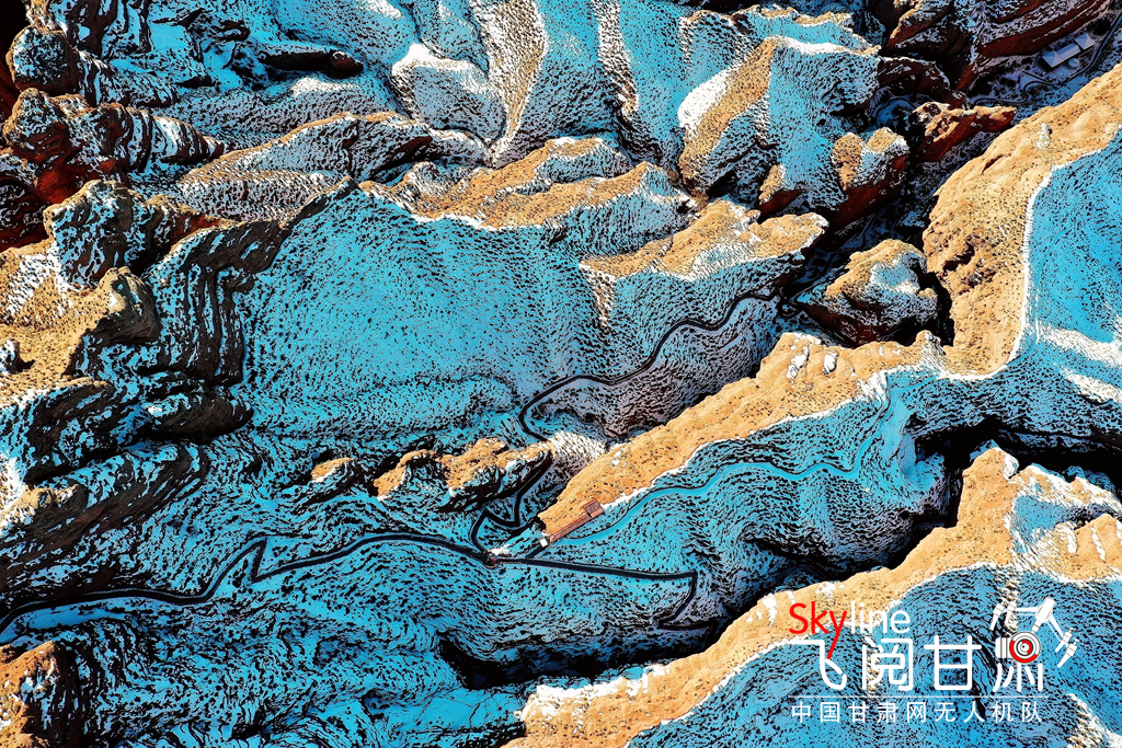 12月26日,俯瞰大雪覆蓋的甘肅省張掖平山湖大峽谷景區,銀裝素裹中顯露出褐色丹霞,宛如一幅美麗畫卷,吸引眾多的游客踏雪賞景。(無人機照片)