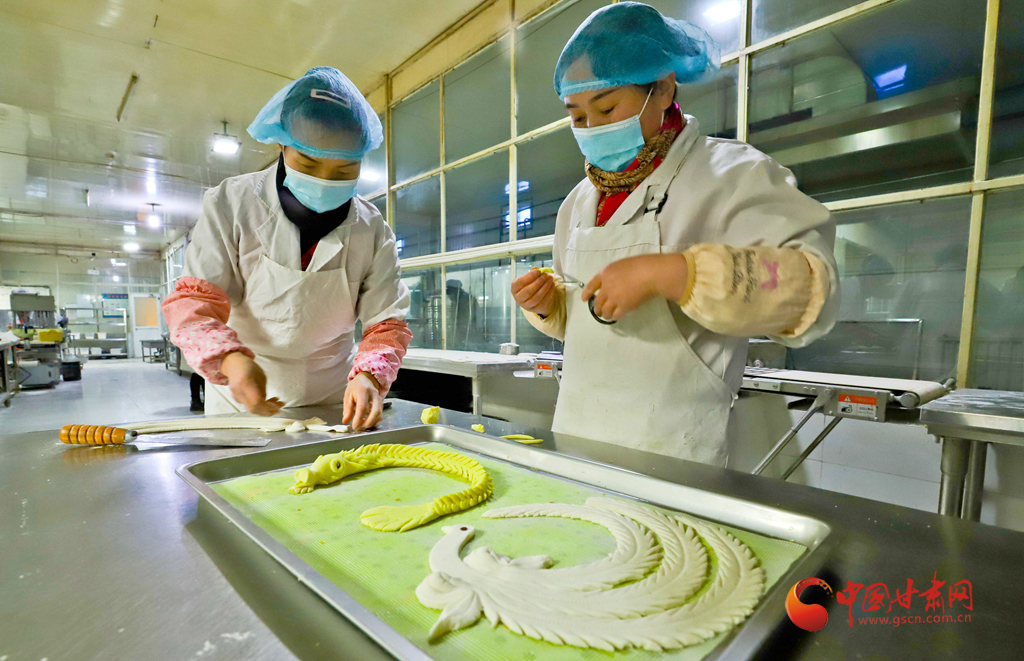 1月6日,甘肅民樂縣隴上鄉村農業科技公司鄉村饃饃加工車間里員工正在精心制作“龍鳳呈祥花饃饃”。