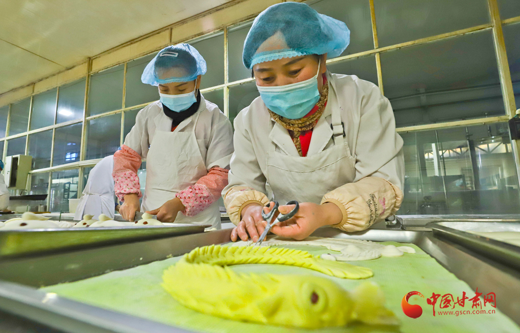 1月6日,甘肅民樂縣隴上鄉村農業科技公司鄉村饃饃加工車間里員工正在精心制作“花饃饃”。