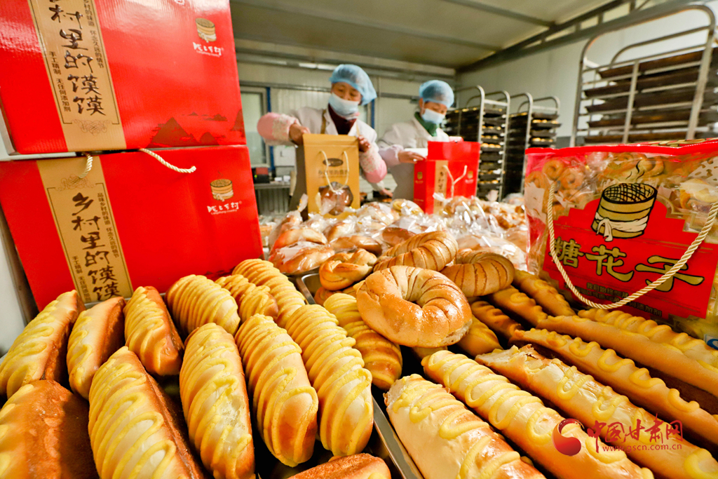 1月6日,甘肅民樂縣隴上鄉村農業科技公司鄉村饃饃加工車間里員工正在精心包裝“花饃饃”。