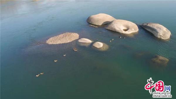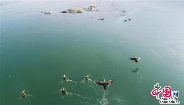 1月12日,在湖南桃江羞女湖國家濕地公園當地攝影家協會成員用無人機有幸拍到一群正在資江戲水的野生保護物種——斑嘴鴨。
