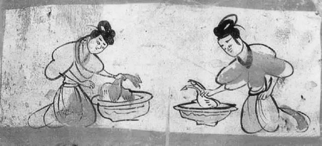 燙雞圖壁畫磚就出土于5號墓葬,這是繪制在一塊單塊磚面上的壁畫,磚面上用刷得甚薄的含膠白堊土作底,正中繪制二婢相對跪坐,袖子高高挽起,眉毛微撇,聚精會神地在各自的盆內燙雞去毛。左邊盆內雞有冠,為公雞形象;右邊盆內雞無冠,似為母雞形象。用色較為單純,以墨、赭石和朱為主。畫面寥寥數筆,將婢女勞動的情況表現得淋漓盡致,極具生活趣味。尤其是雞脖子被抓住的樣子非常傳神, 生動地表現出寫實的情境。我們從中可以看到,1600多年前的人們殺雞處理食材,跟現在我們殺雞燙毛毫無二致。