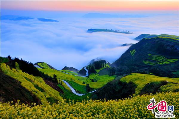 云南省羅平縣無處不風景。春季的馬街,桃花、梨花、李花、山茶花、油菜花、杜鵑花、馬纓花把一座座山峰映襯得如詩如畫。佇立牛頭山俯視云層,漫無邊際的白云在山麓翻滾、碰撞、擁擠,雖沒有海的蔚藍與呼嘯之態,卻有海的浩瀚與壯闊。站在山巔呼吸沁人心脾的清新空氣,聽山風掠過林梢的聲音,云霧升騰時如夢如幻,仿佛有仙人騰云駕霧下凡而來。