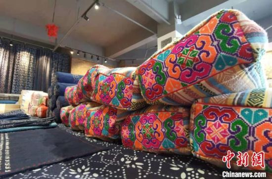 近日,中新網記者在安定區一家非遺工坊內見到祁輝,她身著正紅色漢服,腰間掛著香囊,穿梭于服飾區、布偶區和染布區之間。記者看到,工坊內展出商品種類多樣,色彩豐富,包括潮流挎包、時尚發卡、卡通布偶、可愛抱枕,以及扎染服裝和圍巾等,在極具古風創意的同時,還不乏國潮設計理念。