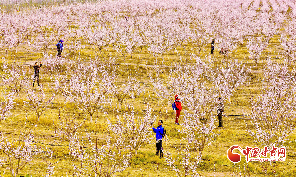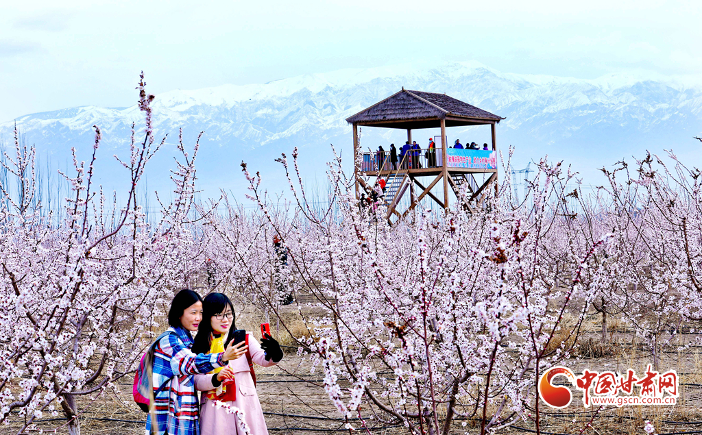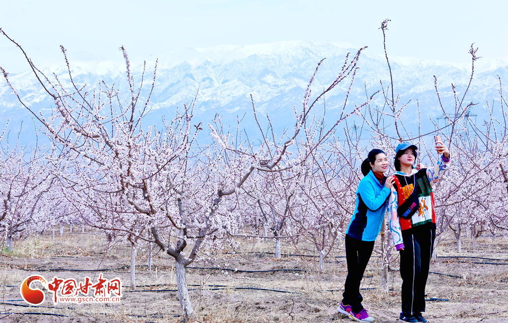 4月3日,游客(ke)在祁連(lian)山下的甘肅張掖(ye)甘州區(qu)金滿園(yuan)千畝杏園(yuan)種植基地里賞花和拍照留念。