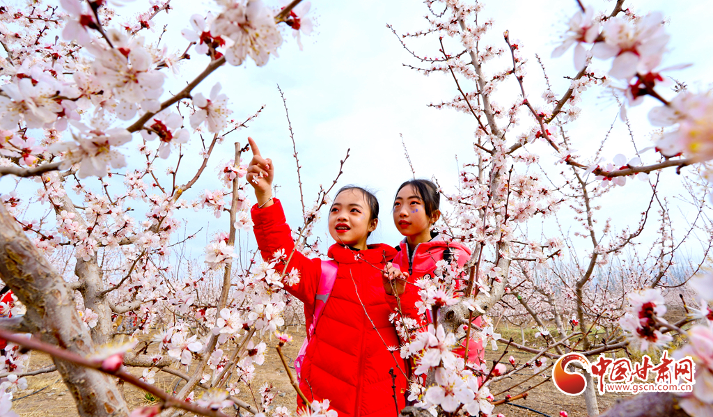4月3日,小(xiao)朋友(you)在甘肅張掖甘州(zhou)區(qu)金滿園千畝杏園種植基地杏花園里(li)賞花。
