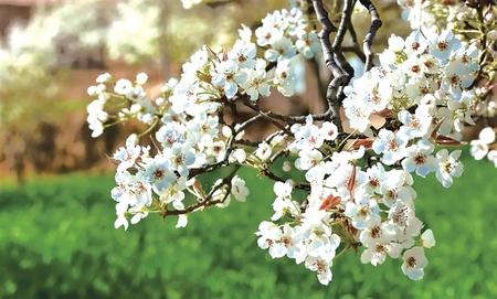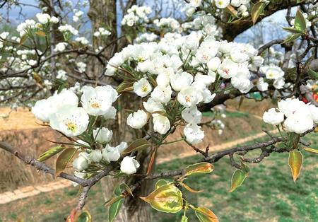 一樹(shu)樹(shu)、一朵朵雪白的梨花迎風搖曳,散發出陣(zhen)陣(zhen)清香。