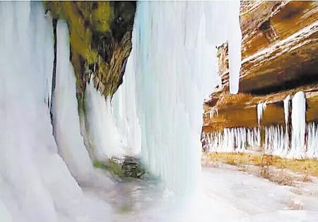 谷底右(you)側的(de)一(yi)簾冰(bing)瀑(pu),寬(kuan)大,高懸(xuan),氣勢磅礴。冰(bing)瀑(pu)表(biao)面層層疊疊起(qi)伏的(de)水波,在陽光下跳躍閃爍,熠熠生輝。雙層飛瀑(pu)形成了一(yi)道長(chang)長(chang)的(de)冰(bing)廊,廊內冰(bing)壁(bi)直立(li),廊外巨幅冰(bing)簾低垂。如玉的(de)冰(bing)掛漸(jian)(jian)長(chang)漸(jian)(jian)細,或(huo)大或(huo)小(xiao),或(huo)寬(kuan)或(huo)窄的(de)窗(chuang)口,分分合合,錯(cuo)落(luo)有致地開在冰(bing)瀑(pu)的(de)縫隙(xi)間。