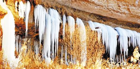 小(xiao)(xiao)路隨著山(shan)勢(shi),曲折(zhe)延(yan)伸(shen)。對面荒(huang)坡上(shang)隨處(chu)可見大大小(xiao)(xiao)小(xiao)(xiao)的(de)(de)洞(dong)穴(xue),不知是(shi)經(jing)年風(feng)蝕,還是(shi)人工開采沙子所(suo)致(zhi)。洞(dong)穴(xue)四周,散(san)落(luo)著小(xiao)(xiao)小(xiao)(xiao)的(de)(de)冰瀑,有的(de)(de)似乎(hu)只有盈盈一(yi)握。長長短(duan)(duan)短(duan)(duan)的(de)(de)冰掛(gua),一(yi)綹(liu)(liu)一(yi)綹(liu)(liu),一(yi)排一(yi)排,遠(yuan)遠(yuan)近(jin)近(jin)錯(cuo)落(luo)有致(zhi)地(di)覆在(zai)山(shan)坳里,垂在(zai)砂(sha)石(shi)間,掛(gua)在(zai)懸(xuan)崖上(shang)。一(yi)些(xie)細(xi)細(xi)長長的(de)(de)冰溜,像(xiang)極了臘月里母親剛出(chu)鍋(guo)的(de)(de)粉條(tiao)。搭在(zai)院(yuan)子竹竿上(shang)的(de)(de)一(yi)掛(gua)粉條(tiao),下邊還垂著水(shui)珠(zhu),上(shang)邊早(zao)已(yi)凍成了細(xi)細(xi)的(de)(de)冰棒,而滴(di)落(luo)在(zai)地(di)上(shang)的(de)(de)水(shui)已(yi)凝(ning)成了冰堆。